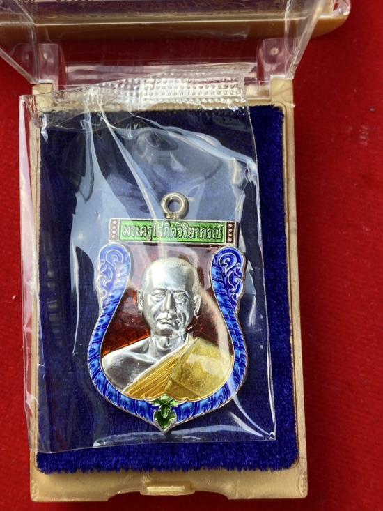 ออกวัด 2,500 เหรียญเสมาหน้าแซยิด หูเชื่อมโบราณ เจริญพร ลาภมาไม่ขาด หลวงพ่ออิฏฐ์ วัดจุฬามณี เนื้อเงินลงยาแดง ลงยาจีวร เลข10507