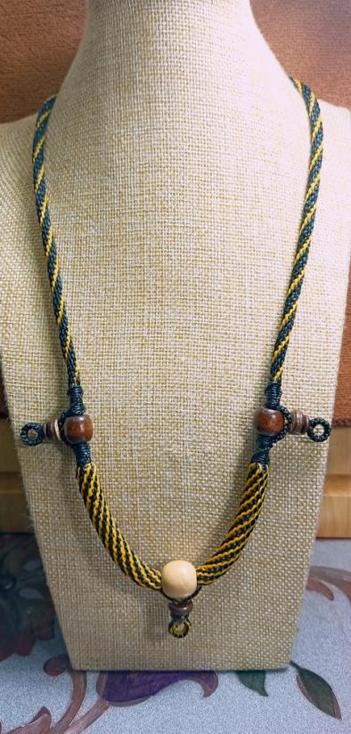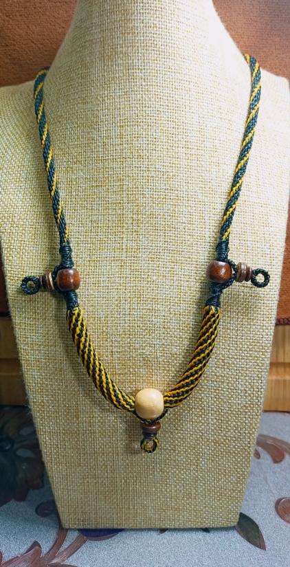 สร้อยคอเชือกเทียน งานถักมือ ( สีดำ-เหลืองทอง + แซมลูกปัดไม้ธรรมชาติ ห้อยพระ 3 องค์ ) ยาว 22 นิ้ว ครับ |