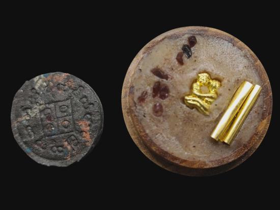 พญายูงคำ รุ่นแรก เนื้อก้นครก และ ตลับไม้สีผึ้งเนื้อหอม รังผึ้งร้าง ขวางเดือนขวางตะวัน รุ่นแรก ฝังอิ่น ตะกรุด ในเมตตาบารมี เจ้าปู่จั่นต่า กาวิสาละ พญานกยูง ขนาดเท่าเหรียญสิบบาท