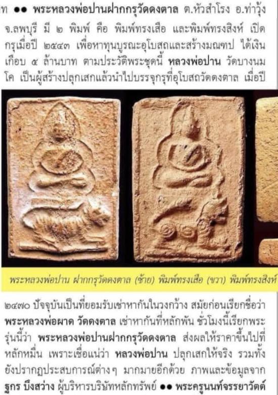 พระที่หลวงพ่อปาน วัดบางนมโค สร้างและปลุกเสกตามคำขอของหลวงพ่อผาด เพื่อที่จะนำมาบรรจุที่วัดดงตาล (วัดสามัคคีธรรม) หลวงพ่อปาน จึงได้สร้างเป็นพระพิมพ์ พระพุทธรูปพิมพ์ประทับเสือ,สิงห์เป็นพระเนื้อดินขนาดเล็กตัดขอบ ด้านบนเจาะบรรจุผงวิเศษ แบบเดียวกับพระที่ท่านสร้างขึ้นที่วัดบางนมโค หลังจากหลวงพ่อปานปลุกเสกพระชุดนี้ทั้งหมดแล้ว ก็มอบให้หลวงพ่อผาดนำมาวัดดง พระชุดนี้มีแจกช่วงก่อนบรรจุกรุเมื่อปี ๒๔๗๐-๒๔๗๔ มีไม่มากนัก จะมาแตกกรุจริงๆ เมื่อปี ๒๕๔๓ แต่ก็ยังไม่ค่อยเผยแพร่มากนัก เนื่องจากเป็น วัดบ้านนอก อีกทั้งกรรมการวัดก็ไม่มีความเข้าใจเรื่องการนำเสนอ คงปล่อยให้เป็นไปตามธรรมชาติ เพิ่งจะมาเผยแพร่อย่างจริงจังเมื่อปี