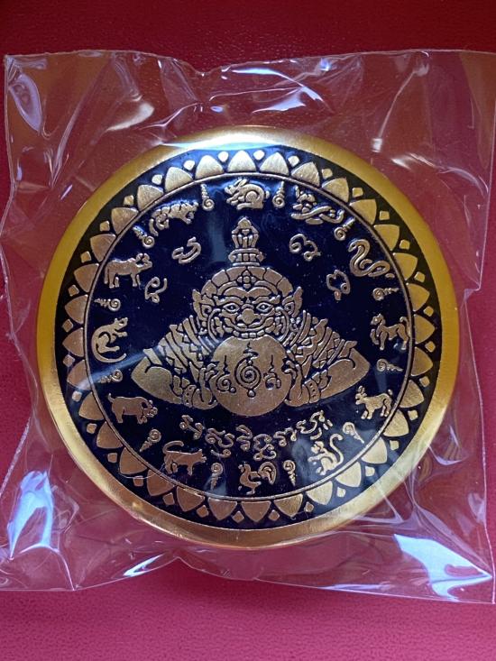 เคาะเดียวแดง สีผึ้งพระราหู รุ่น มงคลจักรวาล เนื้อ โลหะชุบทองลงยาสีดำขอบดำ ขนาด5ซม |