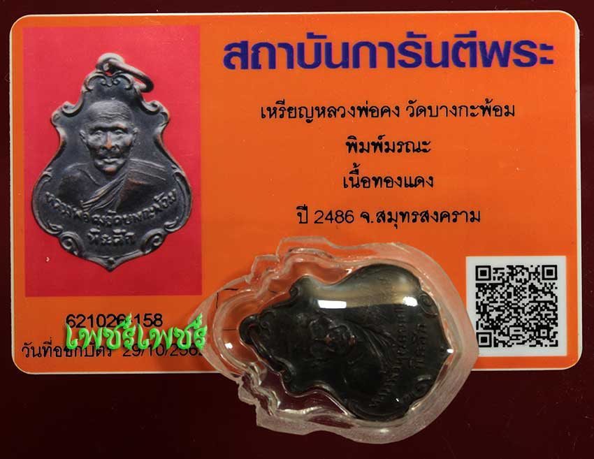 เหรียญ หลวงพ่อคง วัดบางกะพ้อม พิมพ์มรณะ เนื้อทองแดง ปี2486 จ.สมุทรสงคราม สภาพสวยคมชัดดำเดิมๆ สภาพนี้หายากมาก เลี่ยมพลาสติกรักษาผิว พร้อมบัตรรับรองพระแท้จากการันตีพระสบายใจได้พระแท้แน่นอน ค่ะ |
