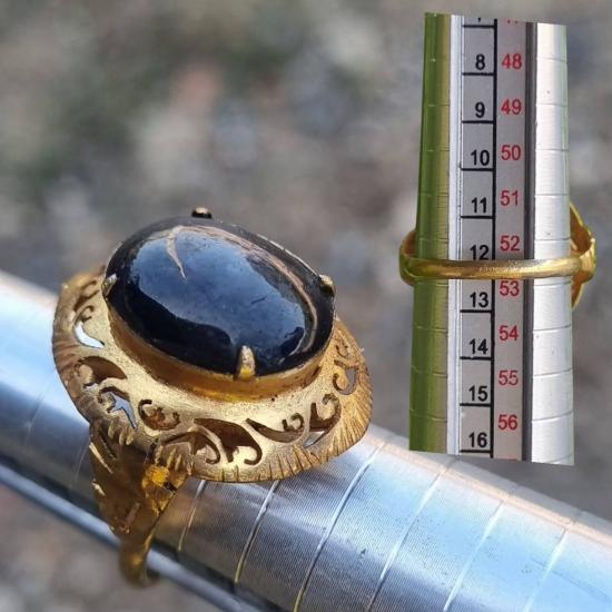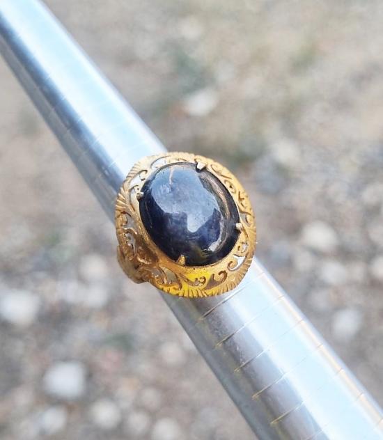 แหวนประดับพลอยสตาร์แซฟไฟร์ นิหล่า เนื้อเทียนแบบดิบ (ไม่ผ่านการเผา) ฉลุลายแบบโบราณแบบหัวมอญ พลอยมีขนาดประมาณ 13.9 x 10.7 มิลลิเมตร ตัวเรือน โลหะชุบทอง