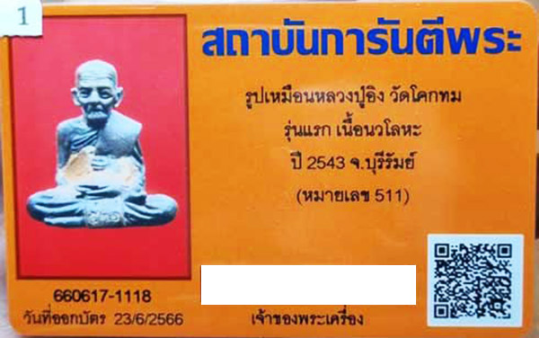 รูปเหมือน รุ่นแรก หลวงปู่อิง วัดโคกทม เนื้อนวโลหะ ปี 2543 พร้อมบัตรรับรอง