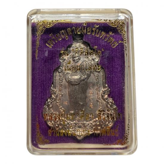 เหรียญยืนอุ้มบาตร หรือเหรียญลายมือรับทรัพย์ หลวงปู่มหาศิลา สิริจันโท รุ่น อิติสุคโต ปี 2564 เนื้อนวะ หมายเลข 2020 กล่องเดิม |