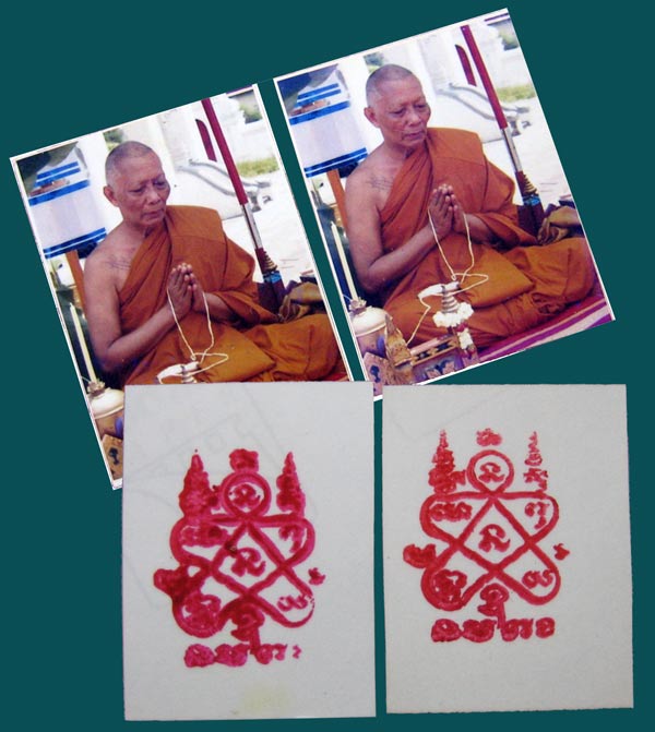 พระนาคปรกมะขาม เนื้อทองฝาบาตร ๒ องค์ หลวงพ่อสาคร วัดหนองกรับ ปี ๒๕๕๓ พร้อมรูปถ่ายหลวงพ่อสาครหลังปั๊มยันต์ห้าด้วยหมึกแดงอีก ๒ ใบครับ