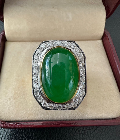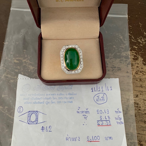 แหวนทำมาใส่ ออกงาน 1 ครั้งครับ ขนาดแหวน 62 ครับ น้ำหนักทองไม่รวมเพชรกับหยกหนัก 20.63 กรัม หยกซื้อมา 30,000 เป็นหัวหยกมือสอง มีรอยนิดหน่อยครับ