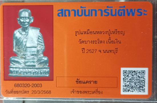 รูปหล่อหลวงปู่เหรียญ วัดบางระโหง นนทบุรี รุ่น 2 ปี 2527 เนื้อเงิน ก้นตอกโค๊ตหงษ์และ๙๐ ฝั่งตะกรุดเงินและหวาย หนึ่งใน 290 องค์ มาพร้อมบัตรจี