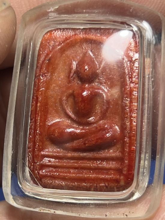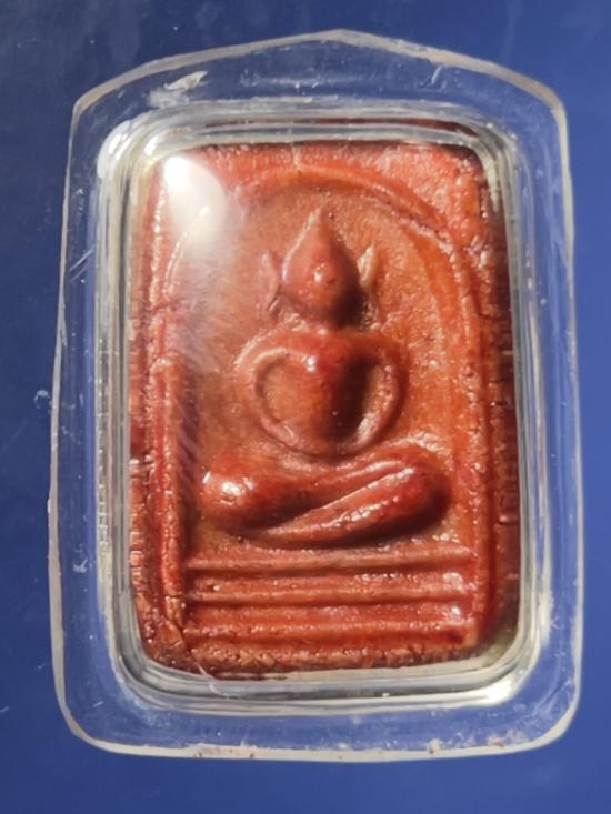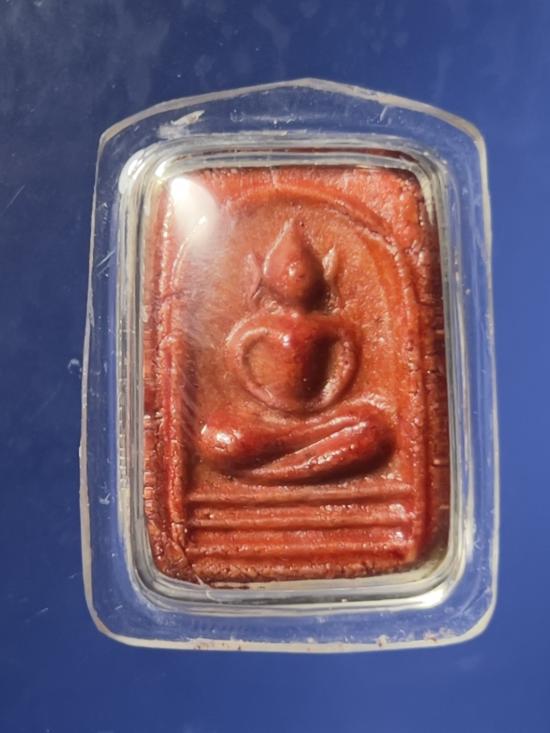 "พระสมเด็จมีกิน เนื้อผงน้ำมันเคลือบสีแดง อาจารย์ลอย โพธิ์เงิน พิมพ์เล็ก ๒๕๑๘" |