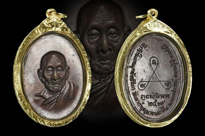 เหรียญหน้าแก่ หลวงปู่สี วัดเขาถ้ำบุญนาค จ.นครสวรรค์ ปี 2519 เลี่ยมทองพร้อมใช้