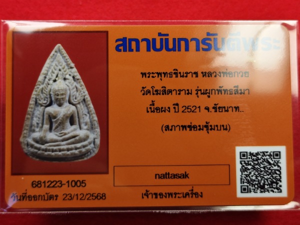 พระพุทธชินราช หลวงพ่อกวย วัดโฆษิตาราม รุ่นผูกพัทธสีมา เนื้อผง ปี2521พร้อมบัตรรับรองบัตรระบุมีซ่อมที่มุมบนของพระ