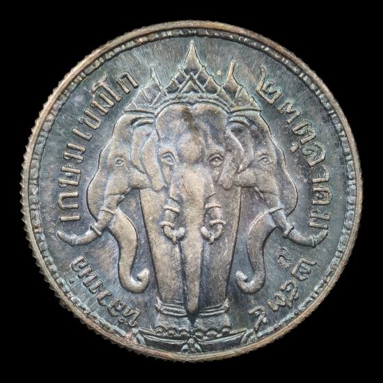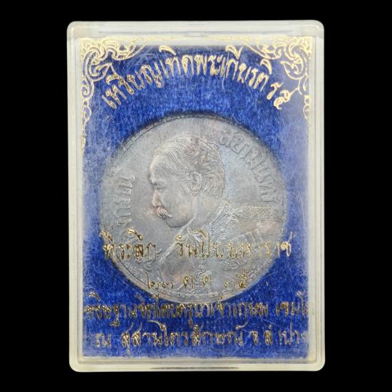 เหรียญที่ระลึก เทิดพระเกียรติ รัชกาลที่ ๕ หลังช้างสามเศียร วันปิยะมหาราช อธิษฐานจิตโดย หลวงพ่อเกษม เขมโก ณ.สุสานไตรลักษณ์ จ.ลำปาง ปี ๒๕๓๕ เนื้อเงิน ตอกโค๊ต ผิวเดิมสวย พร้อมกล่องเดิม