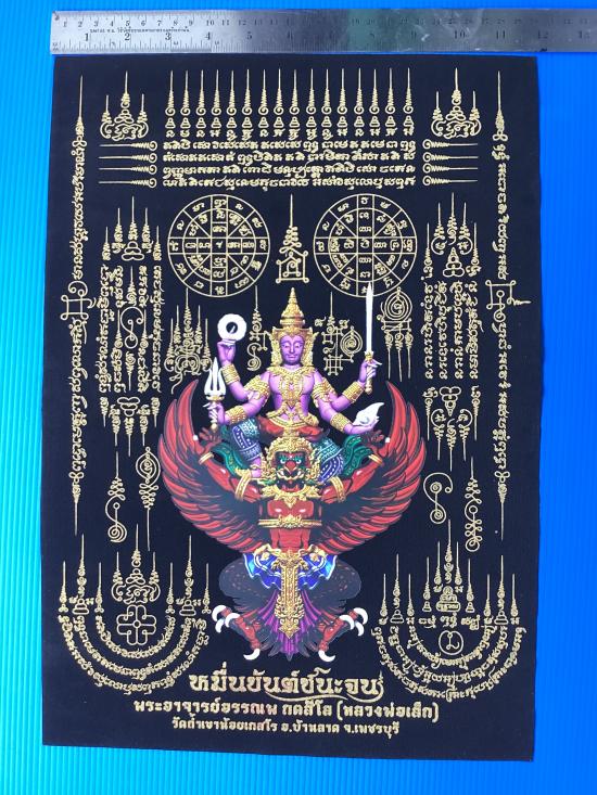 ผ้ายันต์ พระนารายณ์ทรงสุบรรณ หมื่นยันต์ชนะจน พระอาจารย์อรรณพ(อาจารย์เล็ก) วัดถ้ำเขาน้อย จ.เพชรบุรี ผ้ากำมะหยี่สีดำ ขนาด A3 (11.5 นิ้วx 16.6 นิ้ว) |