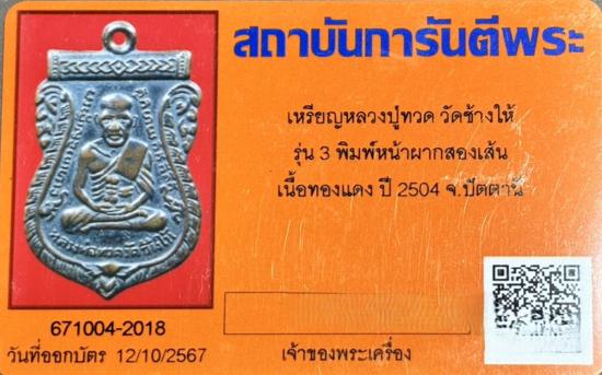 เหรียญหลวงปู่ทวด วัดช้างให้ เหรียญรุ่น 3 บล็อคนิยมหน้าผากสองเส้น ประคตข้างเดียว ปี 2504 พร้อมบัตรรับรอง สนใจสอบถามเพิ่มเติม 0891730266 |