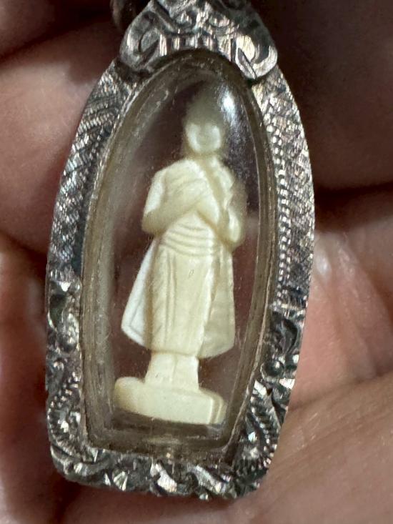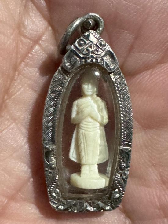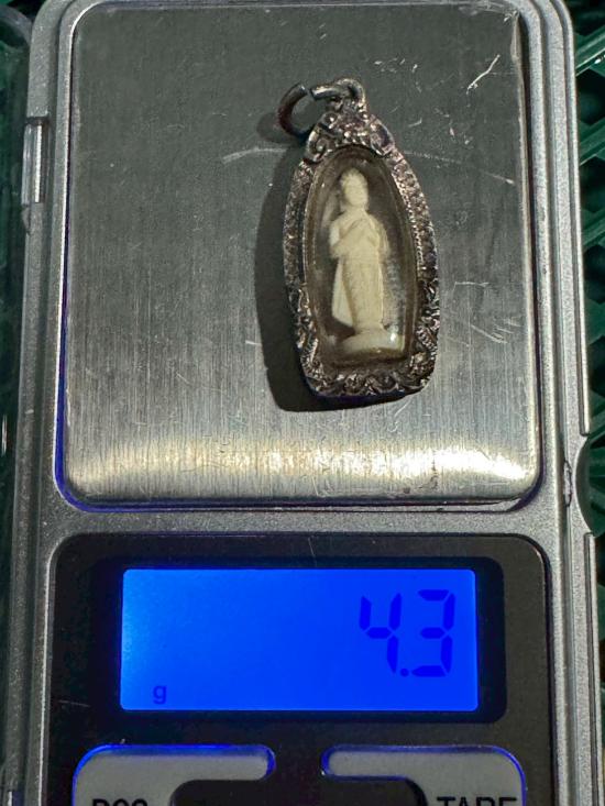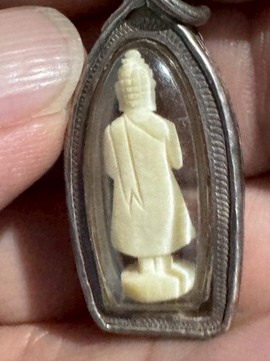 พระปางำพึง เนื้องาแกะ ด้านหลัง มีรอยจารมือ ไม่ทราบที่ เลี่ยมจับขอบเงิน น้ำหนัก 4.3 กรัว รวมงา