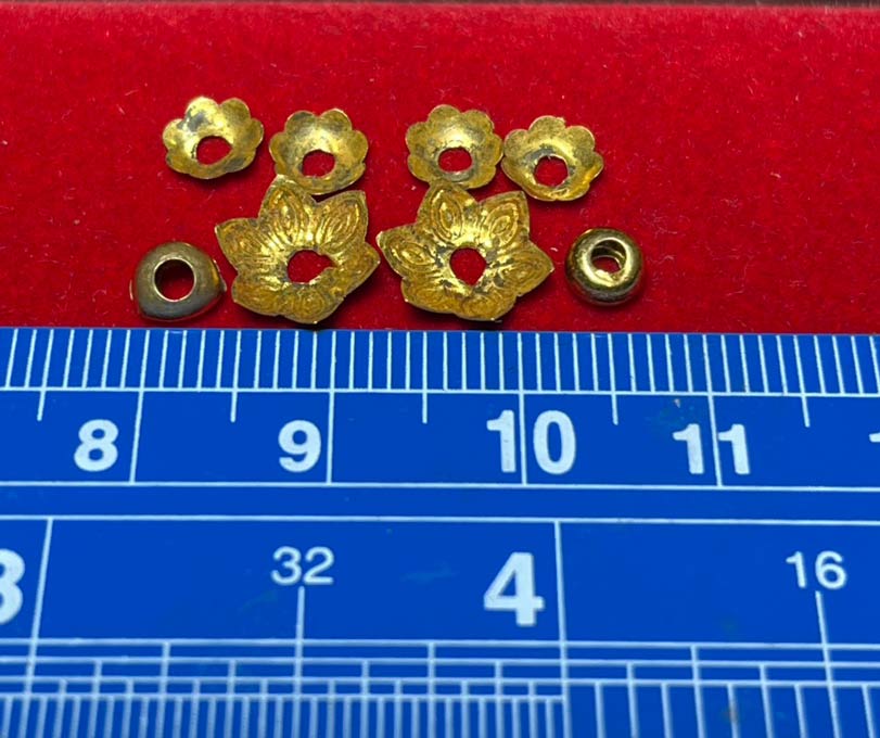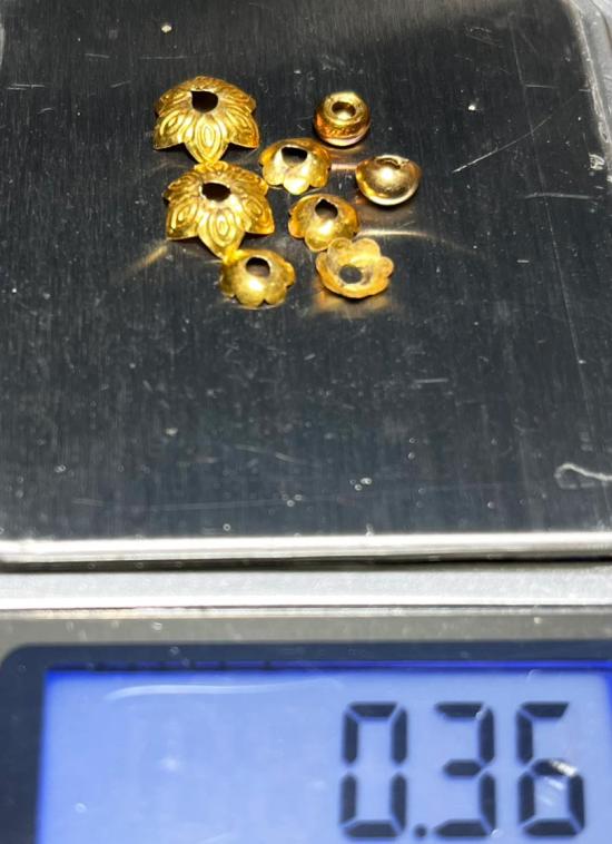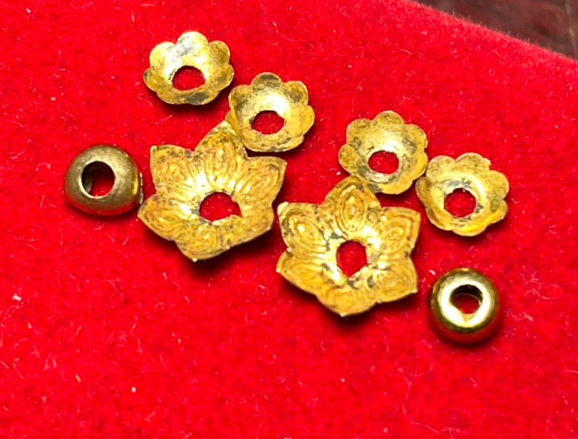 เม็ดทองคำ 2 เม็ด + ฝาครอบทองคำ 6 อัน ขนาดตามรูป พร้อมใบเปอร์เซ็นต์ทอง