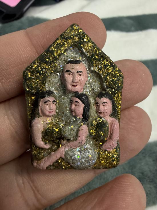 แล้วนำมวลสารดังกล่าวมาผสมรวมกัน ผสมกับน้ำมันมหาเสน่ห์แม่หม้าย 7 สวน จากนั้นท่านก็หาฤกษ์งามยามดี ที่เป็นยามเวลาที่เป็นยามเมตตามหาเสน่ห์ ที่สุดนำมาปลุกเสกอีก 7 ราตรี จากนั้นได้นำผงอาถรรพณ์ดังกล่าวมาผสมรวมกัน มากดพิมพ์ด้วยมือแบบโบราณเรียกสูตรเรียกนามตามตำรับวิชาของเขมรขนานแท้เป็นรูปสาวสามหมู่บ้านกินน้ำบ่อเดียวกัน กดพิมพ์ได้ 1 องค์ ปลุกเสก 1 องค์ (ปลุกเสกทีละองค์) เมื่อได้จำนวนตามที่ต้องการแล้ว จากนั้นก็นำมาปลุกเสกใหม่อีกครั้งหนึ่ง ซึ่งปลุกเสกแยกเดี่ยวกับวัตถุมงคลชิ้นอื่นๆ โดยใช้มนต์คาถาสาวสามหมู่บ้าน , มนต์คาถามหาเสน่ห์, มนต์คาถามหานิยม, และมนต์คาถามหาจักรพรรดิเพื่อเพิ่มบุญเพิ่มวาสนา ลาภยศ สรรเสริญ แก่ผู้นำไปใช้แล้วก็นำไปอาบน้ำมันพรายมหาเสน่ห์