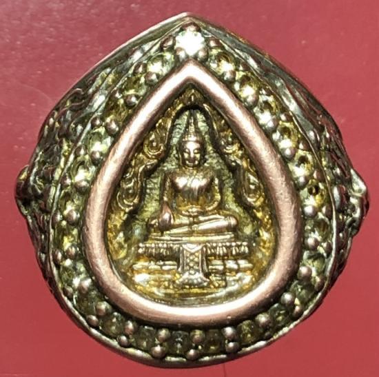 แหวนเนื้อ 3 กษัตริย์ งานช่างแกะสั่งทำ หัวแหวนติดเหรียญหล่อรูปหยดน้ำ หลวงพ่อวัดไร่ขิง นครปฐม ปี2543 เนื้อ 3 กษัตริย์ฝังพลอยรอบวง ขนาดนิ้วผู้ชาย