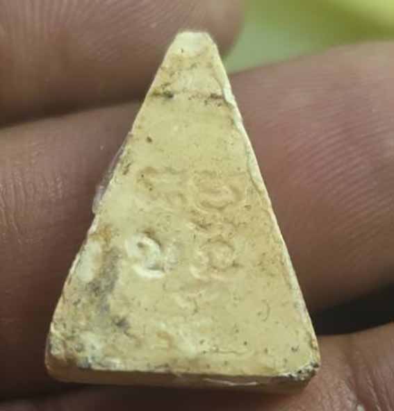 พระของขวัญ วัดปากน้ำ รุ่น4(พระธรรมขันธ์) พิมพ์สามเหลี่ยม เนื้อผง ปี2514 ด้านหลังพื้นผิวมีเทียนเคลือบอยู่เพราะแกะกรอบทองแล้วครับ