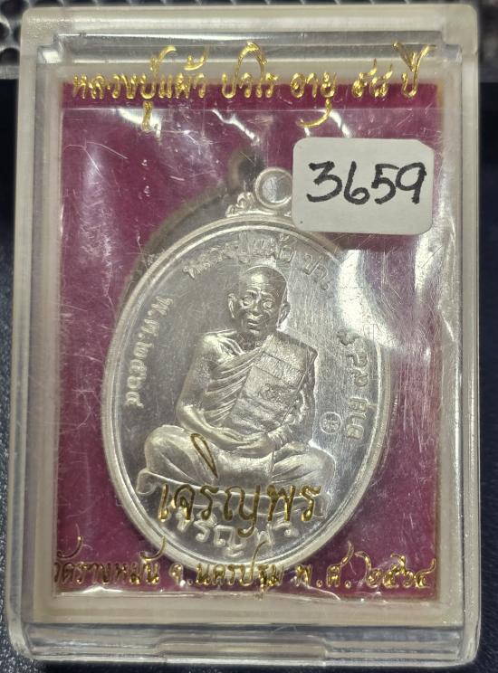 เหรียญเจริญพรล่าง หลวงปู่แผ้ว วัดรางหมัน เนื้อเงิน no.3659 สวยๆใสๆ พร้อมกล่องเดิม