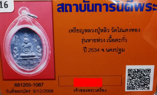 เหรียญหลวงปู่หลิว วัดไร่แตงทอง รุ่นหายห่วง พิมพ์หลังจาร เนื้อตะกั่ว ปี2534 จ.นครปฐม + บัตรG-pra สภาพเดิมค่ะ