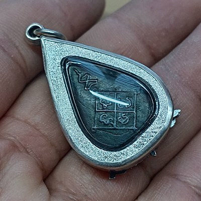 พระกลีบบัวหลังยันต์ เนื้อเมฆพัด หลวงปู่บุญ วัดกลางบางแก้ว จ.นครปฐม พ.ศ. 2470(อายุเกือบ 100 ปี) พร้อมบัตรรับรอง พร้อมเลี่ยมกรอบเงินแท้ งาน 92.5% ขึ้น งานมือหนึ่ง กรอบหนา รมดำ สวยๆ classic. ((พระคัดสวยติดหน้าตาหลังยันต์ชัดหายาก ))