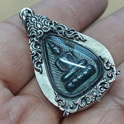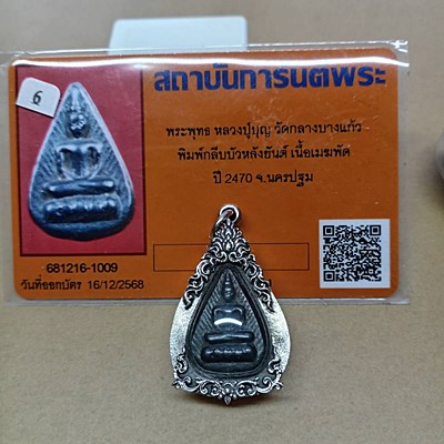 พระกลีบบัวหลังยันต์ เนื้อเมฆพัด หลวงปู่บุญ วัดกลางบางแก้ว จ.นครปฐม พ.ศ. 2470(อายุเกือบ 100 ปี) พร้อมบัตรรับรอง พร้อมเลี่ยมกรอบเงินแท้ งาน 92.5% ขึ้น งานมือหนึ่ง กรอบหนา รมดำ สวยๆ classic. ((พระคัดสว