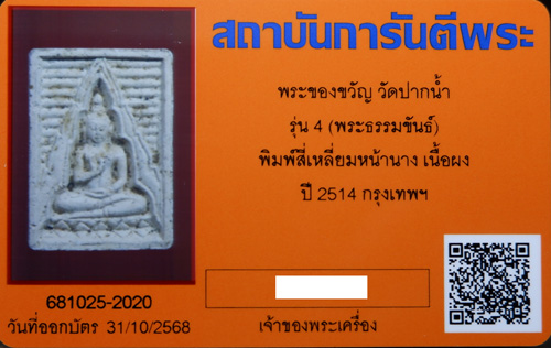 พระสมเด็จวัดปากน้ำ พระธรรมขันธ์ รุ่น4 ปี2514 พิมพ์หน้านาง (นิยม) มีหน้าตาสวย พร้อมกล่องเดิมๆ + บัตรรับรองจาก การันตี G-PRA