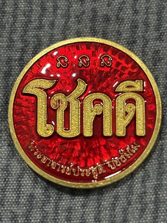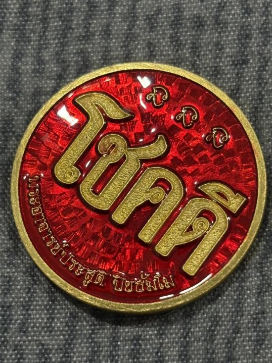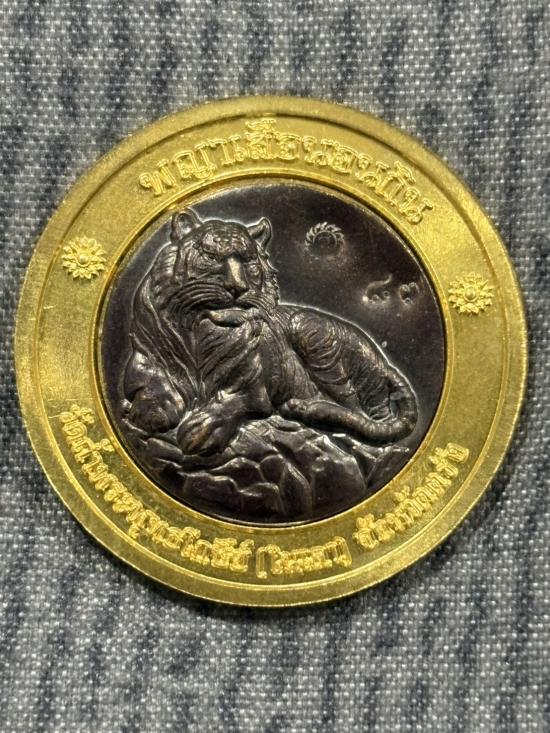 เหรียญโชคดี พญาเสือนอนกิน รุ่นแรก พระอาจารย์ประสูติ (หลวงพ่อประสูติ) วัดในเตา จ.ตรัง เนื้อทองทิพย์ลงยาแดง หน้ากากเสือโลหะอาถรรพ์ หมายเลข 87 พร้อมกล่องเดิมครับ