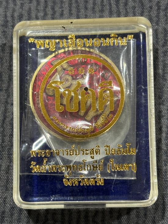 เหรียญโชคดี พญาเสือนอนกิน รุ่นแรก พระอาจารย์ประสูติ (หลวงพ่อประสูติ) วัดในเตา จ.ตรัง เนื้อทองทิพย์ลงยาแดง หน้ากากเสือโลหะอาถรรพ์ หมายเลข 87 พร้อมกล่องเดิม