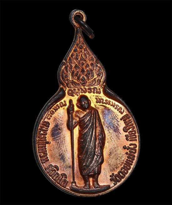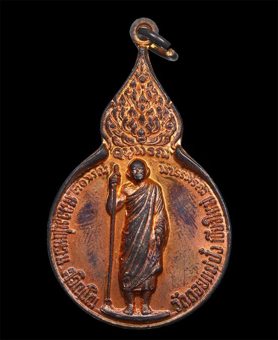 เหรียญยืนถือไม้เท้า รุ่นรวมใจ ( 5 แชะ ) หลวงปู่แหวน วัดดอยแม่ปั๋ง จ.เชียงใหม่ ปี 2518