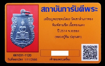 เหรียญพระพุทธโสธร วัดเขาสำเภาทอง พิมพ์สามขีด เนื้อทองแดง ปี2514 จ.ระยอง (หลวงปู่ทิม ปลุกเสก) พร้อมบัตรรับรอง
