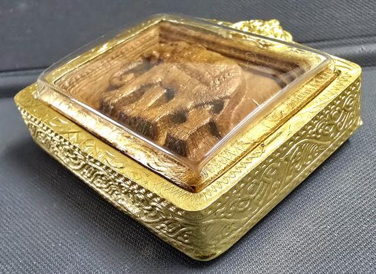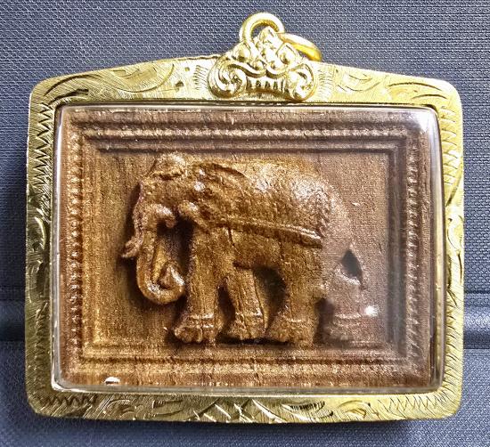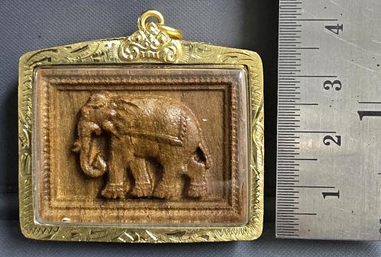 ไม้มงคลแกะรูปช้างเต็มตัว เลี่ยมกรอบชุบทอง หลังเลเซอร์ชื่อหลวงปู่