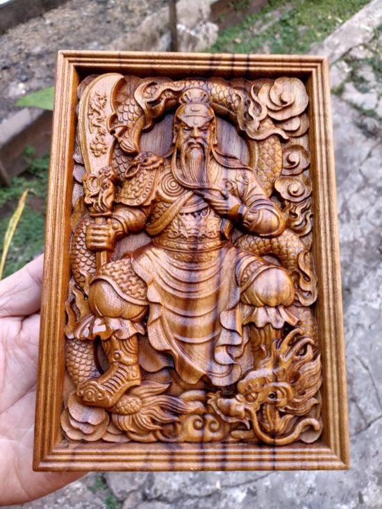 เทพกวนอู ไม้สักแกะสลักมงคล.กว้าง 14 ซม.สูง20ซม.หนา 2.3ซม. +ขาตั้ง |