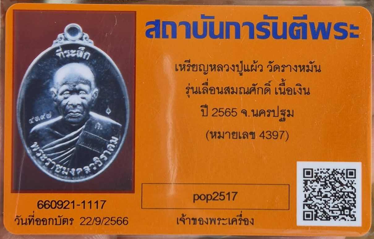 เหรียญหลวงปู่แผ้ว วัดรางหมัน รุ่นเลื่อนสมณศักดิ์ เนื้อเงิน ปี 2565 จ.นครปฐม ( หมายเลข 4397 )