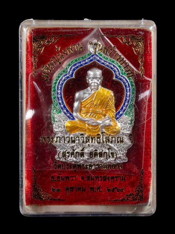 เหรียญนั่งพาน "รุ่นสร้างบารมี" พระมหาสุรศักดิ์ วัดประดู่ จ.สมุทรสงคราม เนื้อเงินลงยาแดง