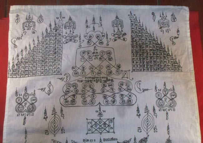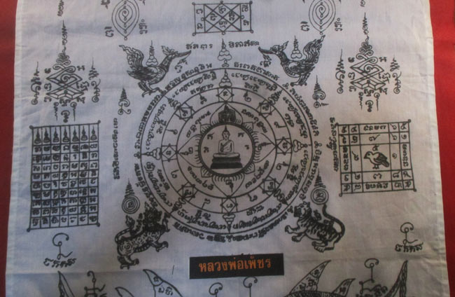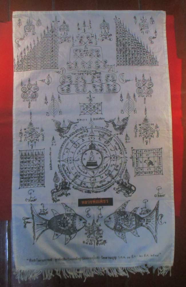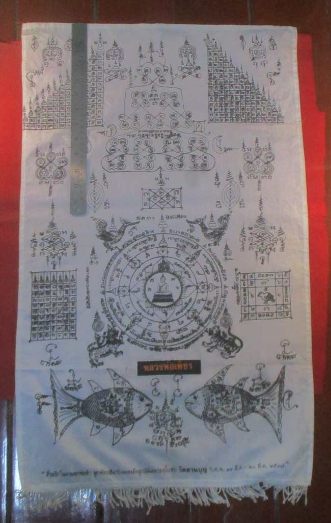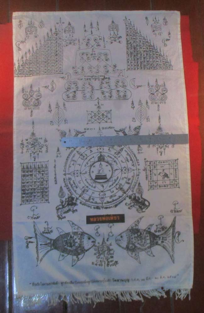 ผ้ายันต์ ที่ระลึกในงานยกช่อฟ้า ผูกพัทธสีมาปิดทองฝังลูกนิมิตพระอุโบสถ วัดลานบุญ ๒๕๓๗ ลวดลายสวย ครับ (พระบ้าน ครับ)