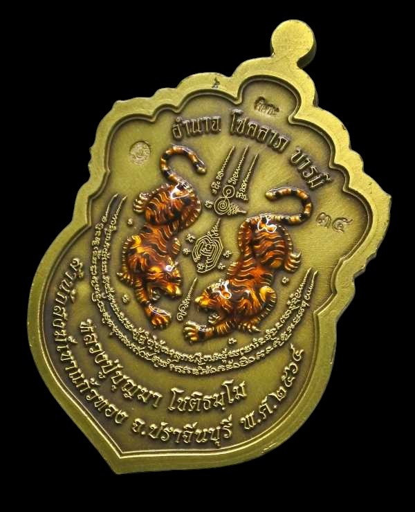 เหรียญรุ่นเสมาเสือคาบดาบ 1 หลวงปู่บุญมา โชติธมโม สำนักสงฆ์เขาแก้วทอง เนื้อทองทิพย์ ซาติน ลงยา หมายเลข 35 พิเศษ |