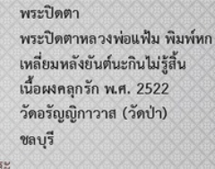 พระปิดตา หลวงพ่อแฟ้ม วัดป่าฯอรัญญิกาวาส ชลบุรี เนื้อผงคลุกรักพิมพ์หกเหลี่ยมหลังยันต์นะกินไม่รู้สิ้น ปี2522 |