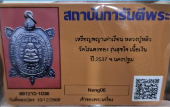 เหรียญ " พญาเต่าเรือน รุ่นสุขใจ เนื้อเงิน วัดไร่แตงทอง " จัดสร้าง 20 ธันวาคม ปี 2537 เมื่อคราวหลวงปู่หลิว ปณฺณโก มีอายุครบ 89 ปี และฉลองผูกพัทธสีมาฝังลูกนิมิตรพระอุโบสถวัดไร่แตงทอง จึงมีการจัดสร้างเหรียญ "พญาเต่าเรือน รุ่นสุขใจ " ประกอบด้วย 1.เนื้อทองคำ สร้างตามจำนวนสั่งจอง (ชุดทองคำ เงิน และนวะ) 2. เนื้อเงิน จำนวน 20,000 เหรียญ 3. เนื้อนวโลหะ จำนวน 20,000 เหรียญ 4. เนื้อทองแดง จำนวน 84, 000 เหรียญ ***สำหรับเนื้อเงิน เหรียญนี้สภาพสวยแชมป์ ไม่ผ่านการใช้บูชา ครับ**** ( คาถาบูชาพญาเต่าเรือน หลวงปู่หลิว ก่อนภาวนา ให้ตั้งนะโม 3 จบ และท่องคำว่า "นะมะพะทะ นาสังสิโม สังสิโมนา สิโมนาสัง โมนาสังสิ นะอุทะกะ เมมะอะอุอะ " )