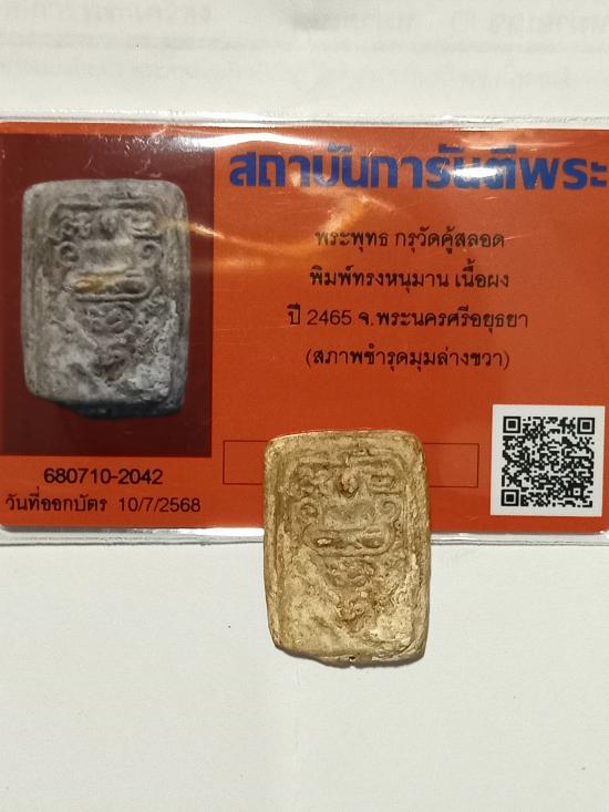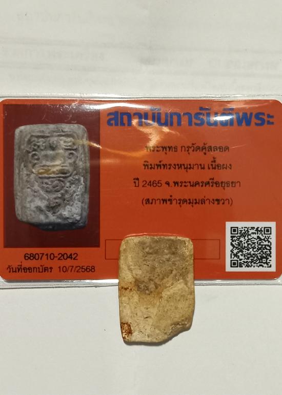 เคาะเดียวแดง++พระพุทธ กรุวัดคู้สลอด พิมพ์ทรงหนุมาน เนื้อผง ปี 2465 จ.พระนครศรีอยุธยา (พร้อมบัตรสภาพชำรุดมุมล่างขวา)