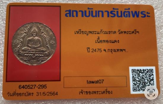 เหรียญพระแก้วมรกต วัดพระศรีฯ ปี 2475 เนื้อทองแดง พร้อมบัตรรับรอง