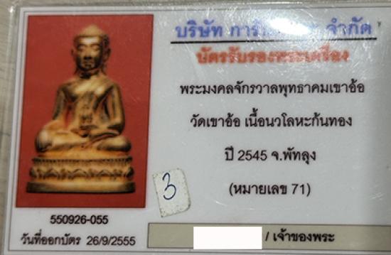 พระกริ่งมงคลจักรวาล "พุทธาคมเขาอ้อ" เนื้อนวะโลหะแก่ทองคำก้นทอง จ.พัทลุง ปี ๒๕๔๕.."หมายเลข 71"..สภาพสวยเดิม เก็บเก่า ไม่ได้ใช้ พร้อมกล่องเดิม..ในปี ๒๕๔๔ พระครูอดุลธรรมกิตติ์ หรือ ที่ปัจจุบันรู้จักกันดีในนามพ่อท่านกลั่น เจ้าอาวาสสำนักวัดเขาอ้อ ได้ร่วมกับ พล.ต.ต.ขุนพันธรักษ์ราชเดช ศิษย์ฆราวาสยุคเก่าวัย ๑๐๔ ปี (ในขณะนั้น) เจ้าของฉายา มือปราบหนังเหนียวฆราวาสจอมขมังเวท จัดสร้างมหามงคลวัตถุ รุ่น ขุนพันธ์พุทธาคมเขาอ้อ โดยมีวัตถุประสงค์เพื่อเป็นการเผยแพร่เชิดชูชื่อเสียงเกียรติคุณของสำนักวัดเขาอ้อซึ่งเคยโด่งดังเลืองลือมานานนับพันปี และเพื่อหาปัจจัยมาบูรณะปฏิสังขรณ์เสนาสนะภายในวันเขาอ้ออย่างต่อเนื่อง มหามงคลวัตถุ รุ่น ขุนพันธ์พุทธาคมเขาอ้อ ได้สร้างความนิยมศรัทธาต่อมหาชนอย่างท้วมท้นจนก่อเกิดคุณประโยชน์มากมายนานัปการต่อสำนักวัดเขาอ้อทั้งในทางตรงและทางอ้อม ..ในปี๒๕๔๕ นี้ก็นับเป็นอีกวาระหนึ่งที่พ่อท่านกลั่น และ พล.ต.ต.ขุนพันธรักษ์ราชเดชได้ร่วมกันจัดสร้างมหามงคลวัตถุ รุ่น มงคลจักรวาลพุทธาคมเขาอ้อ ขึ้นโดยมีวัตถุประสงค์ในการจัดสร้างเช่นดังครั้งก่อน และเพื่อเป็นการเฉลิมฉลองเนื่องในวาระที่พ่อท่านกลั่นมีสิริอายุครบ ๘๘ ปี มหามงคลวัตถุรุ่น มงคลจักรวาลพุทธาคมเขาอ้อ ที่จัดสร้างในครั้งนี้ยังยึดถือความพิถีพิถันเพรียบพร้อมสมบูรณ์ในทุกๆ ด้านเช่นเดิม ไม่ว่าจะเป็นในด้านรูปลักษณ์พิมพ์ทรงซึ่งทุกแบบพิมพ์มีความประณีตสวยงามประทับตาประทับใจ ในด้านเนื้อหาชนวนมวลสารศักดิ์สิทธิ์ที่มีกฤตยาคมพูนเพิ่มทวีคูณเพราะนำชนวนมวลสารที่เหลืออยู่มากมายจากรุ่น ขุนพันธ์พุทธาคมเขาอ้อ มาจัดสร้าง และในด้านพิธีกรรมประจุพุทธาคมอันเข้มขลังศักดิ์สิทธิ์จะอุบัติขึ้นรวมสามวาระมหามงคลด้วยกันคือพีธีกรรมครั้งที่ ๑ ได้ประกอบพิธีเททองแบบโบราณตามตำรับสำนักวัดเขาอ้อ สำเร็จเรียบร้อยไปแล้ว เมื่อวันอาทิยต์ที่ ๒๓ ธันวาคม ปี๒๕๔๔ ณ สำนักวัดเขาอ้อ โดยมีพ่อท่านกลั่น พล.ต.ต.ขุนพันธรักษ์ราชเดช, อาจารย์ ฉันท์ทิพย์ พันธรักษ์ราชเดช, อาจารย์ ประจวบ คงเหลือ และพระเกจิอาจารย์ชื่อดังสายเขาอ้ออีก ๘ รูป ร่วมกันประกอบพิธี ซึ่งในวันพิธีมหามงคลครั้งนี้ ได้เกิดปรากฎการณ์มหัสจรรย์เหนือธรรมชาติบังเกิดขึ้นเป็นที่ประจักษ์แก่สายตาของผู้ที่มาร่วมในพิธีเททองทุกท่าน กล่าวคือก่อนพิธีเททองฝนก็ตกลงมาอย่างหนักราวกับฟ้ารั่วตั้งแต่ช่วงเช้า จวบจนถึงฤกษ์พิธีเททองฝนก็ได้หยุดตกอย่างฉับพลัน จากพิธีเททองแล้วเสร็จก็ถึงพิธีเปิดฤกษ์กดพิมพ์พระผงกลมมงค