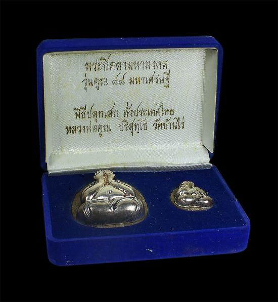 พระปิดตา หน้ากากเงิน หลวงพ่อคูณ วัดบ้านไร่ พิมพ์ใหญ่ และพิมพ์เล็ก เนื้อว่านมงคล ตะกรุดเงิน รุ่นคูณ ๘๘ มหาเศรษฐี พร้อมกล่อง