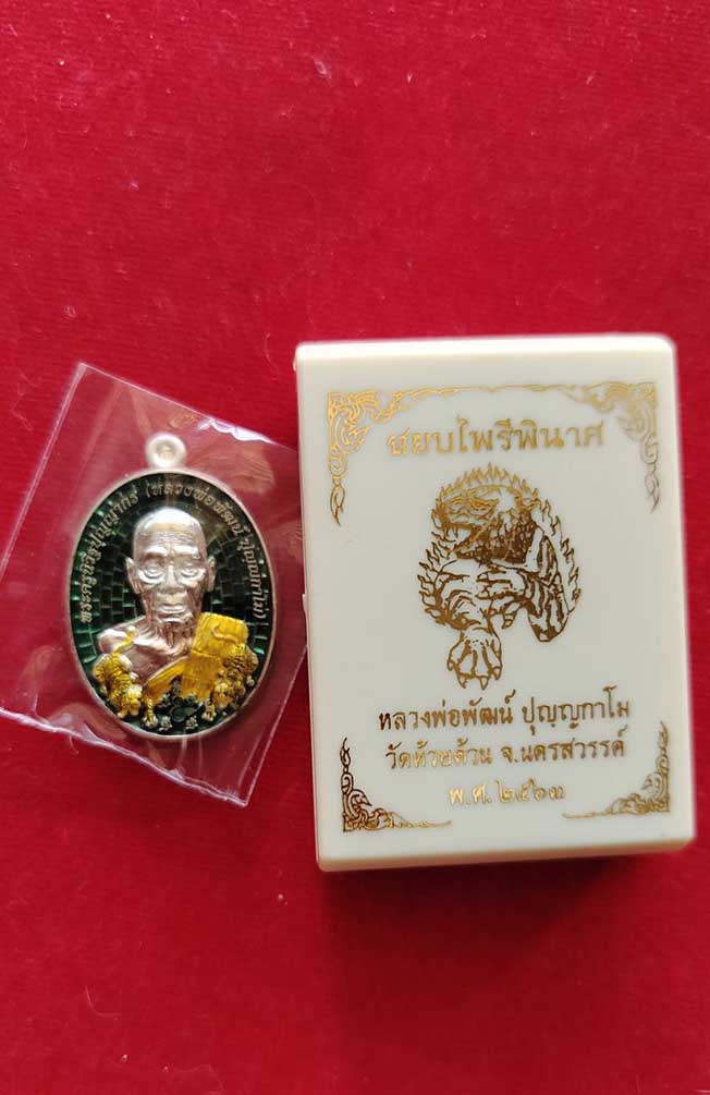 เหรียญสยบไพรีพินาศ หลวงพ่อพัฒน์ วัดห้วยด้วน เนื้อเงิน ลงยา 3สี หลังลงยาเสือรูปไข่ no.680 กล่องเดิม |