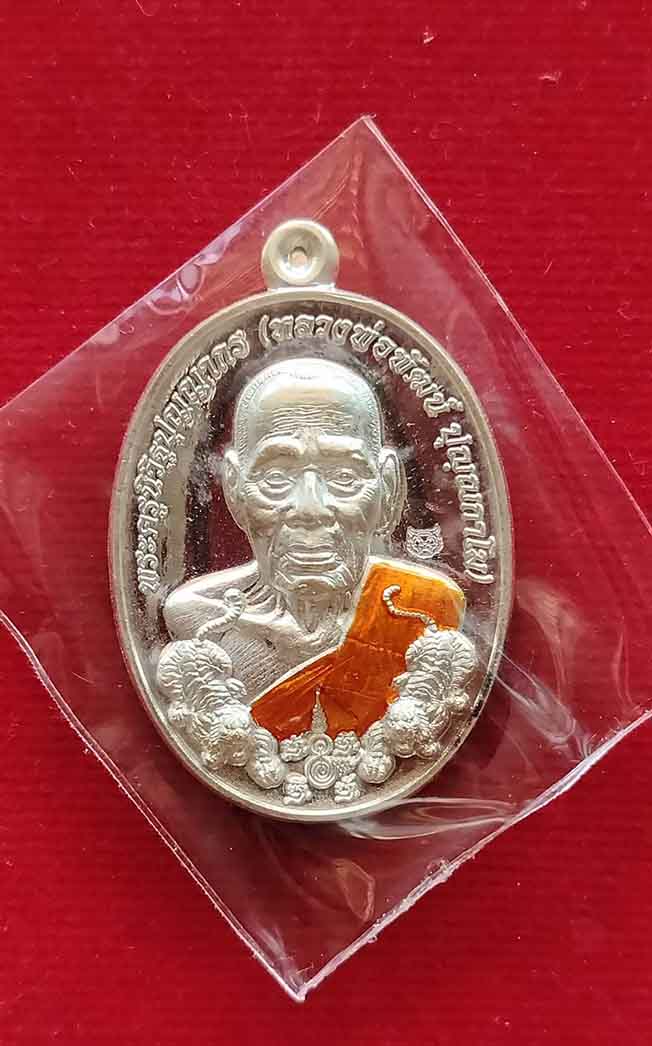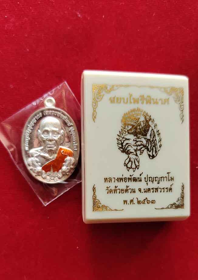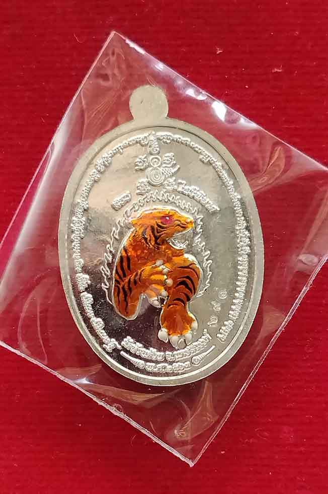 เหรียญสยบไพรีพินาศ หลวงพ่อพัฒน์ วัดห้วยด้วน เนื้อเงิน ลงยาจีวรเหลือง หลังลงยาเสือรูปไข่ no.691 กล่องเดิม |