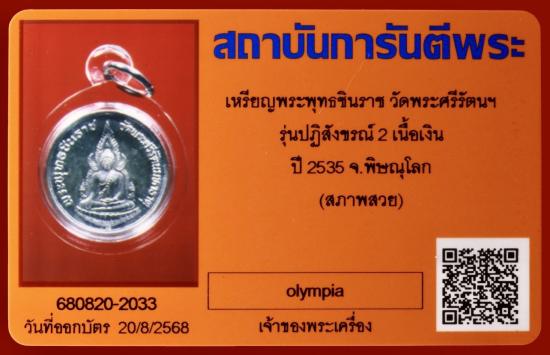 เหรียญพระพุทธชินราช วัดพระศรีฯ จ.พิษณุโลก รุ่นปฏิสังขรณ์ ปี2535 เนื้อเงินสวยกริบเลี่ยมพร้อมใช้ + พร้อมบัตรรับรอง