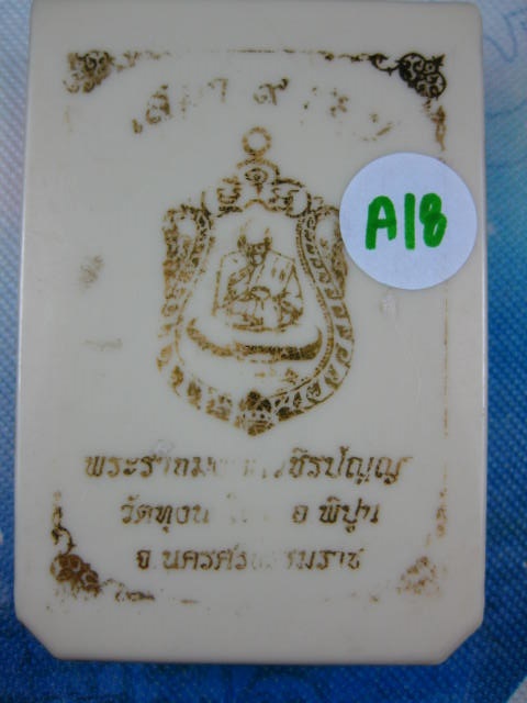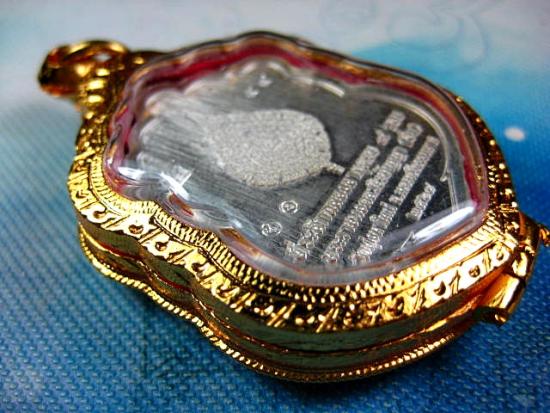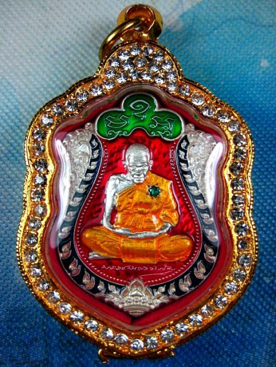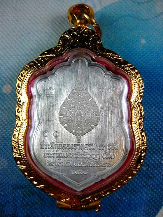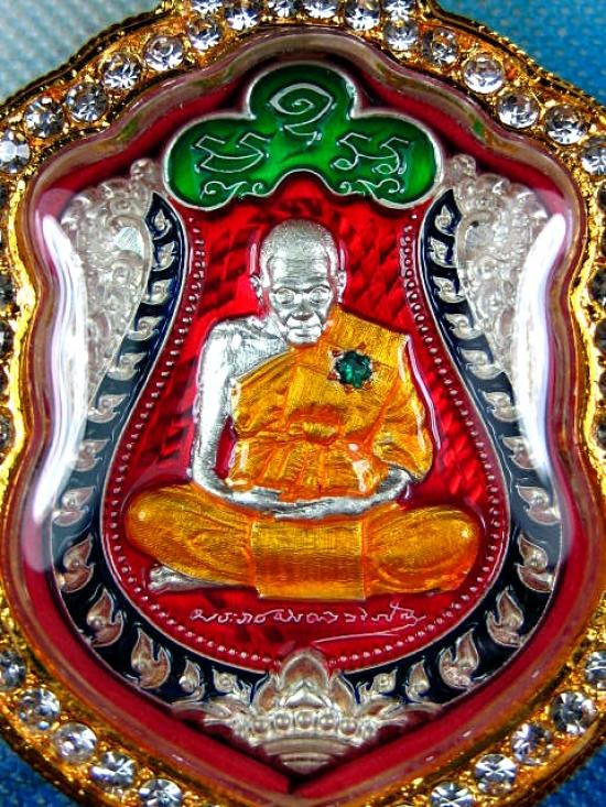 เหรียญเสมาที่ระลึกอายุครบ 9 รอบ เนื้อชุบเงินลงยาผังพลอยเขียว ใส่กรอบอิตาลี่ มีกล่องเดิม หลวงปู่อิ่ม วัดทุ่งนาใหม่ (---A18---) |