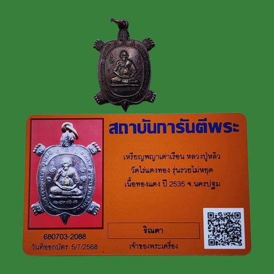 เหรียญพญาเต่าเรือน รุ่นรวยไม่หยุด เนื้อทองแดง หลวงปู่หลิว ปี 2535 + บัตรรับรอง