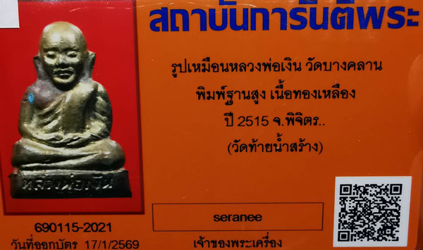 รูปเหมือนหลวงพ่อเงิน วัดบางคลาน พิมพ์ฐานสูง เนื้อทองเหลือง กริ่งดัง ปี2515 จ.พิจิตร(วัดท้ายน้ำสร้าง ) + บัตร G-pra สภาพเดิมค่ะ